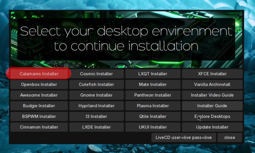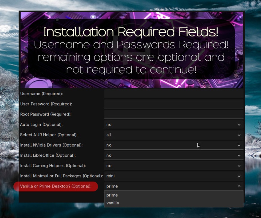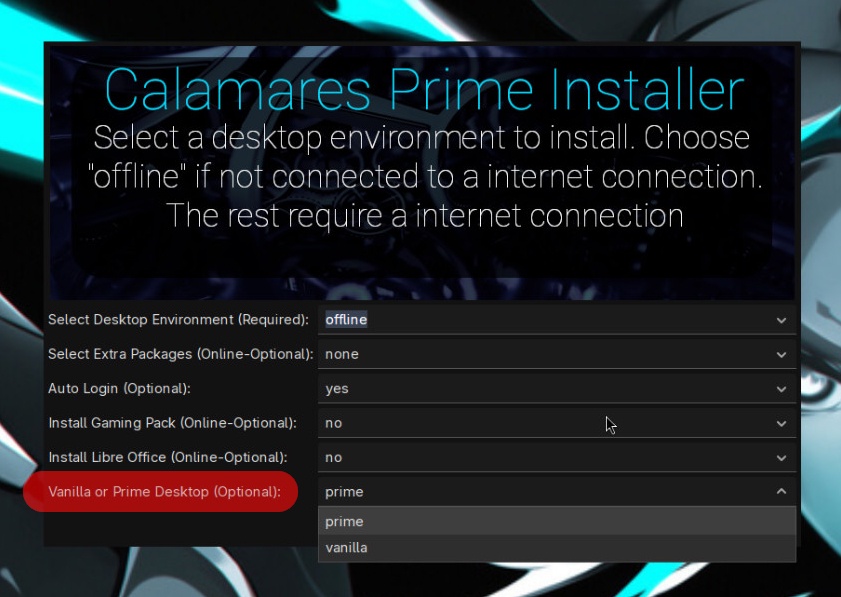 The Prime Installer has a unique feature that allows it to be updated from the ISO image so it can be fixed if issues arise due to dependency issues from Arch Linux. Please note that images may change with each release but the basic functions will remain the same. This method is preferred instead of using the Calamares installer due to constant dependency issues caused by the rolling release policy of Arch Linux. However, The Calamares Installer will be available starting with v3.1.1