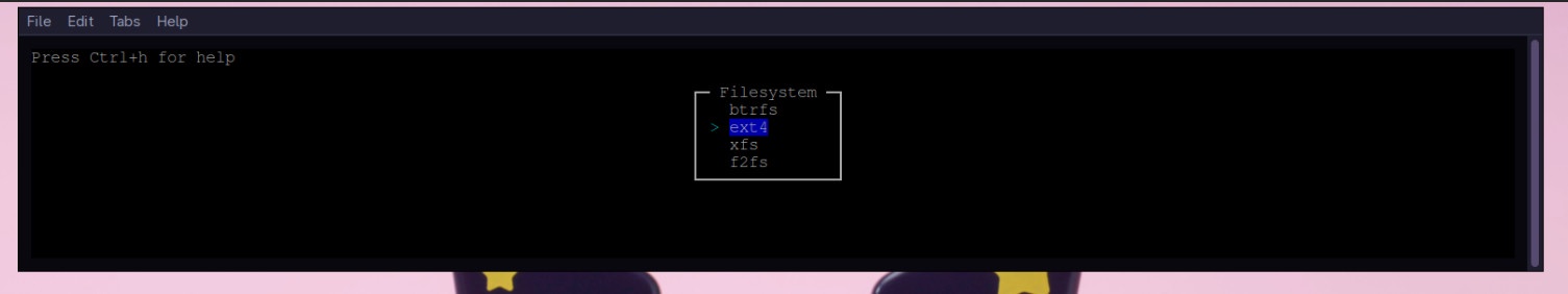 step 4: Select Filesystem. "ext4" is recommended but use whatever you like.